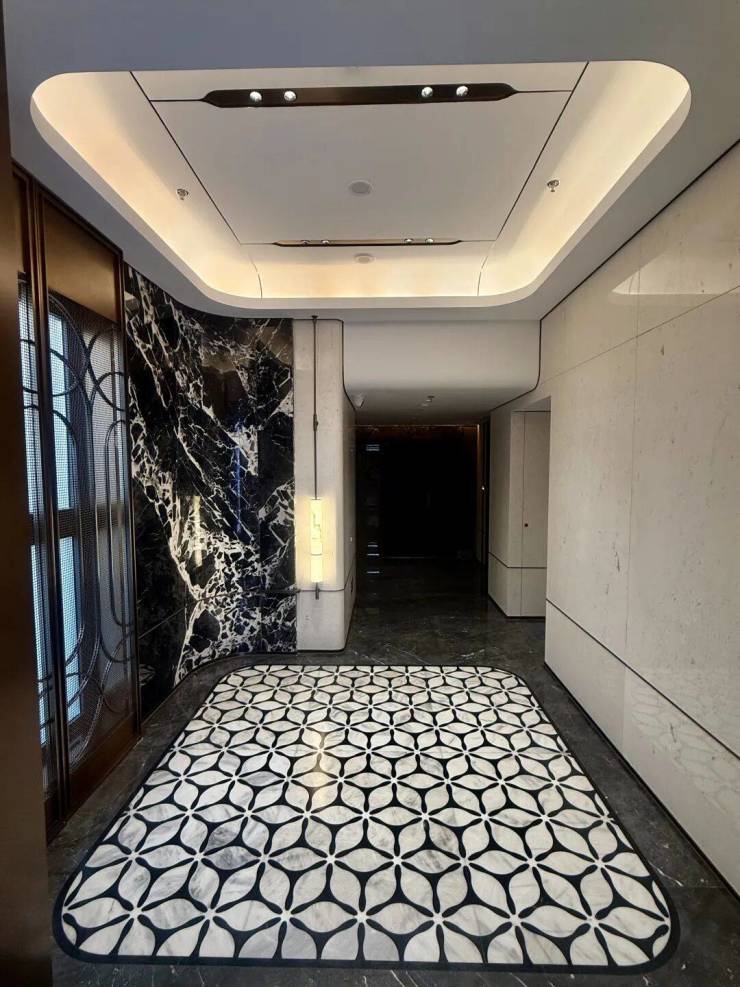 建面约170㎡户型的1楼入户大堂也非常气派,地面是大理石拼花,墙面是花岗岩,弧形吊顶+隐藏射灯,整体形成了低调隐奢的感觉。