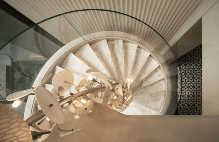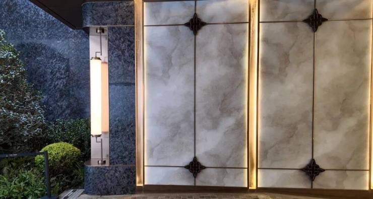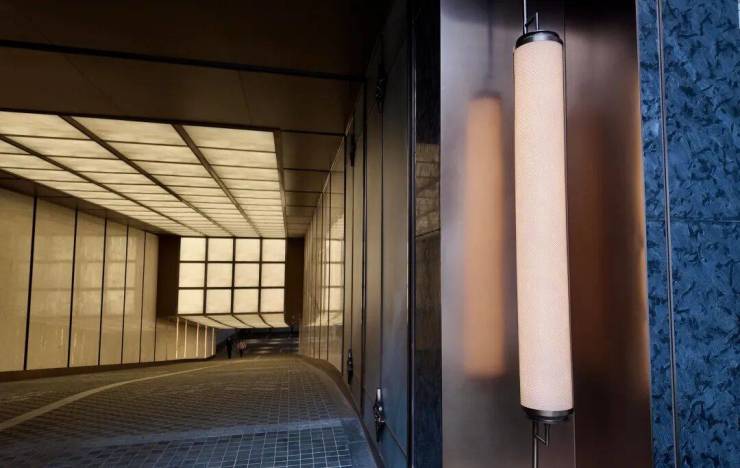坡道墙面以进口石材、透光云石与金属线条组合,灯带延伸如“光影缓冲带”。