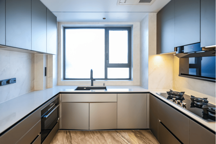 厨房为 U型布局,配备 博世四件套厨电,包含三眼灶、油烟机、洗碗机、蒸烤一体机 ,还有 科勒抽拉龙头及日立厨房空调等 高端品牌。