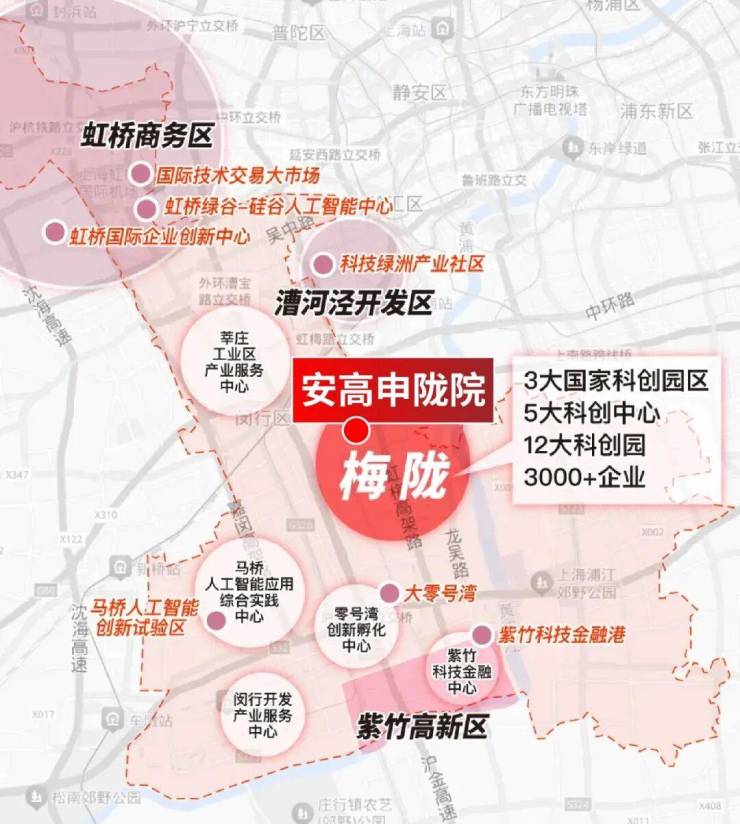 梅陇周边有3大国家级产业区、5大科创中心、12大科创园、3000+企业,直线距离约7公里范围内拥有漕河泾开发区、紫竹高新技术产业园等科创基地。据悉,漕河泾开发区有望入住梅陇,为增强闵行中部地区科技创新活力。