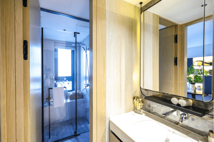 其他卫生间均 通顶铺贴岩板,配备杜拉维特台下盆、汉斯格雅暗装龙头及花洒 ,让每位家人都能拥有专属的洗漱空间,避免早晚高峰的拥挤。
