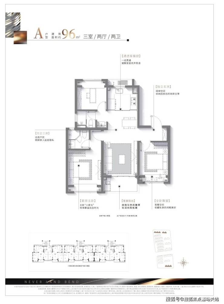建面约96㎡户型 ,性价比极高,是一个低总价上车3房的优质选择。 经典飞机户型+三房两厅两卫设计 ,照顾家人的起居隐私;更有 客餐厨一体化贯通设计 ,使得空间不设限更显大; 主卧“小家化” ,悦享静谧自由生活;进门处设置 独立玄关空间 ,增加收纳的同时,也保护了业主隐私。
