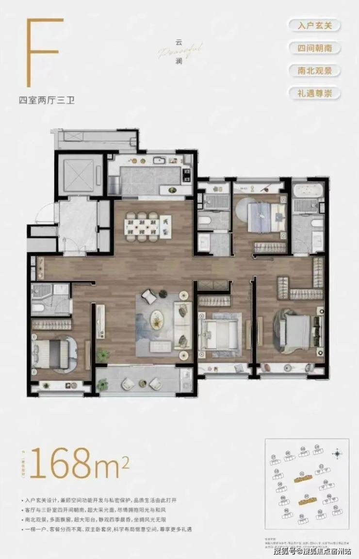 实用性方面,户型3房3卫、南向双套房的设计,可以保证每个家庭成员都能拥有更具私密性的居住空间。
