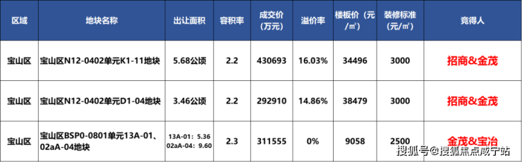 宝山淞南K1-11地块,由金茂&招商竞得,成交总价43.07亿元,溢价率16.03%;