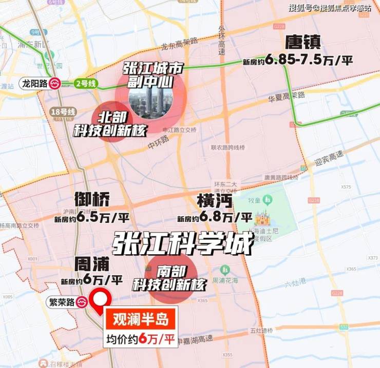 以张江为中心,科学城范围内各板块房价格局。红线范围内唐镇、橫沔、御桥百平米3房总价都在650-700万级。观澜半岛同样是总价600万级买到张江科学城红线范围内地铁房的天赐良机!