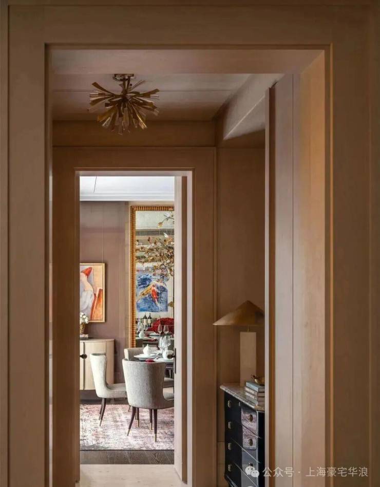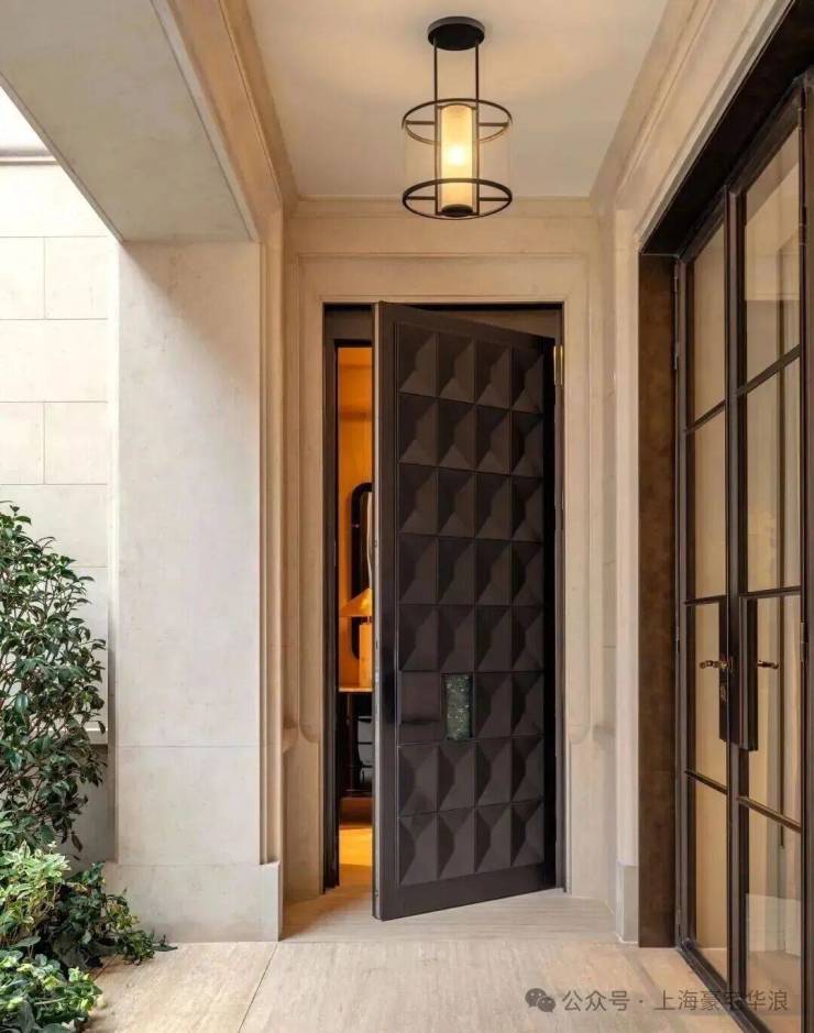 入户空间由一个简约的门厅和楼梯厅组成,门厅配有控制台和嵌入式衣柜。以多功能圆桌为中心的楼梯厅连接着楼梯、电梯、客用卫生间和客厅。空间采用白色洞石搭配特制染色的胡桃木,其浅色调与洞石和谐呼应,同时保留了胡桃木独特的纹理特征。