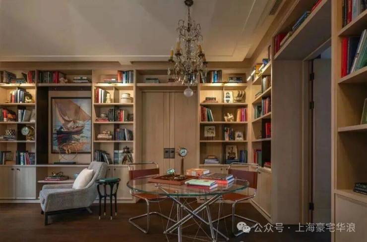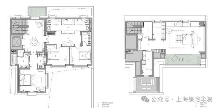 二层设有儿童区和父母房间。所有房间都围绕庭院布置,以充分利用景观视野。我们还将楼梯厅空间改造成家庭图书馆——在这个原本私密的楼层创造了一个公共空间。这为家庭成员增加了除客厅和地下室之外的又一互动空间,强化了我们对现代上海家庭——更多交通和爱的理念。