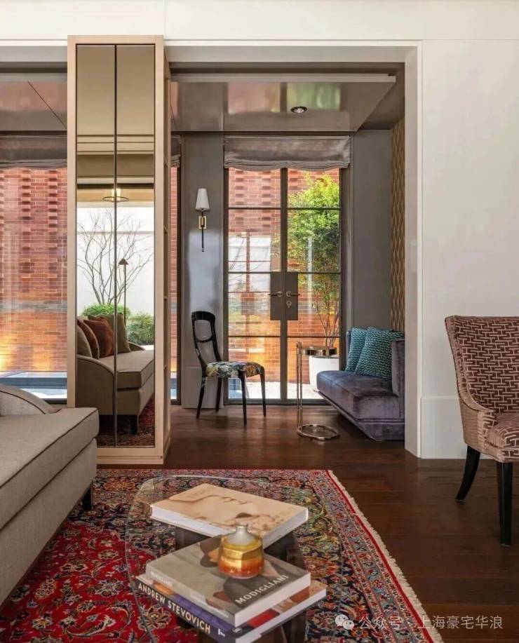 在客厅中,两个展示架巧妙地将空间分隔成主客厅区和休闲室,营造出一个与建筑尺度交相辉映的层次空间。