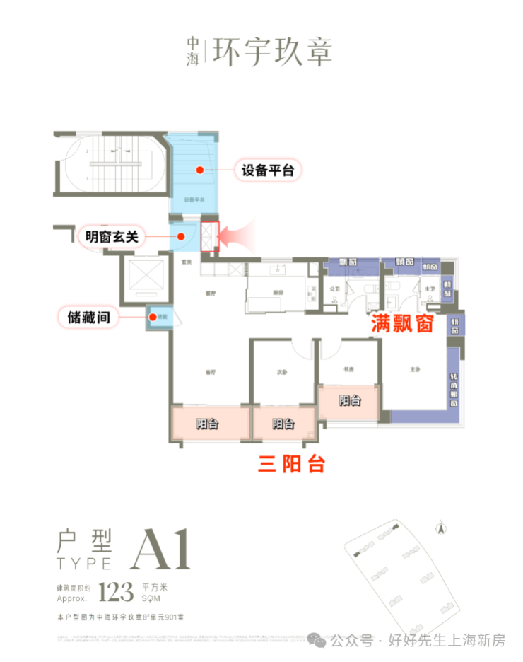 其中以约123㎡最具代表性——四面宽、卧室全朝南,把南向有效面一步拉满。