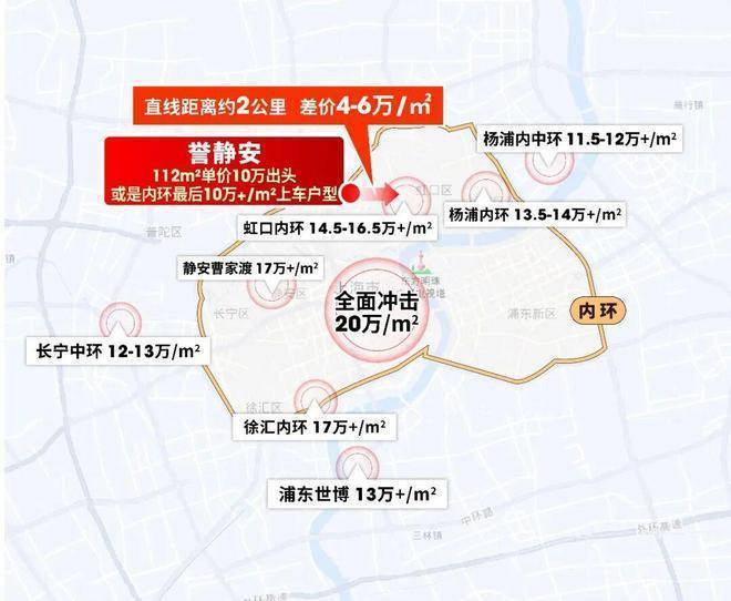 虹口内环已达14.5-16.5万/㎡,与项目直线距离仅约2公里,单价高出4-6万/㎡;