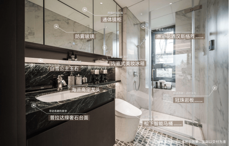 卫生间臻选普拉达绿奢石台面,雍容华贵。同时臻选海派美学金属镜柜搭配防雾玻璃,嵌入美妆冰箱,细节到位。