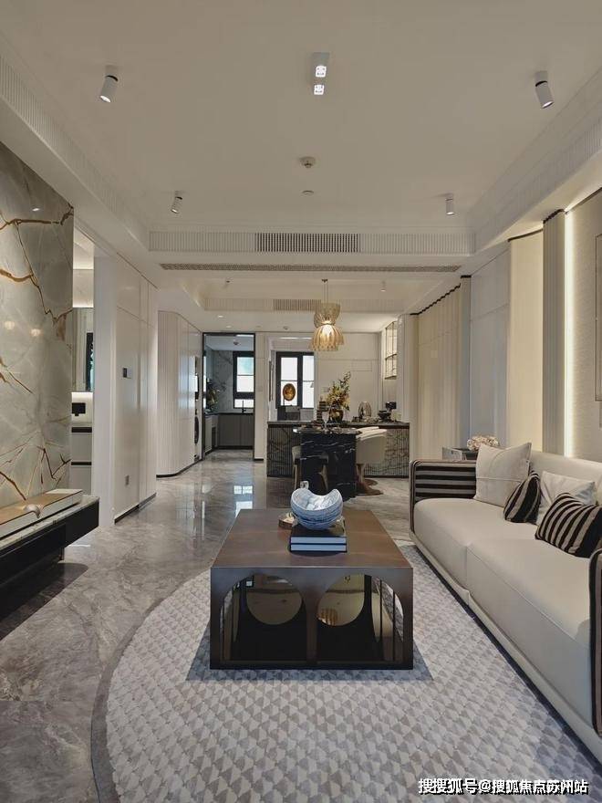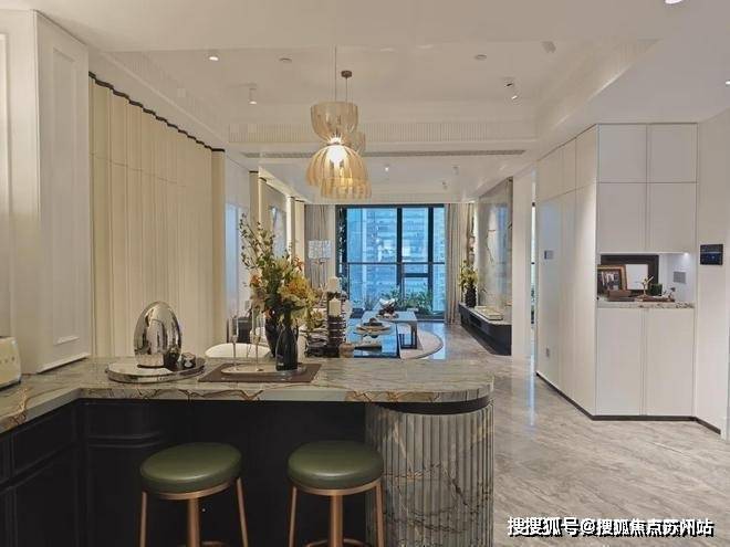 信达信安里预约热线☎:400-8080-420✅✅背景墙比别人更多一点。天然石材的电视背景墙,高级大气;编织皮革的客厅背景墙,充满质感;过度用的是白色木饰纹的背景墙,简约耐看;餐厅处又是白色皮革背景墙,大方优雅。整个空间过渡自然,增加了层次感和高级感。