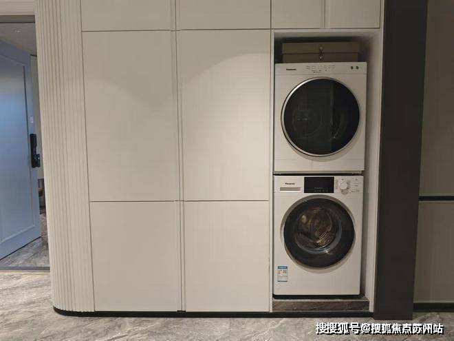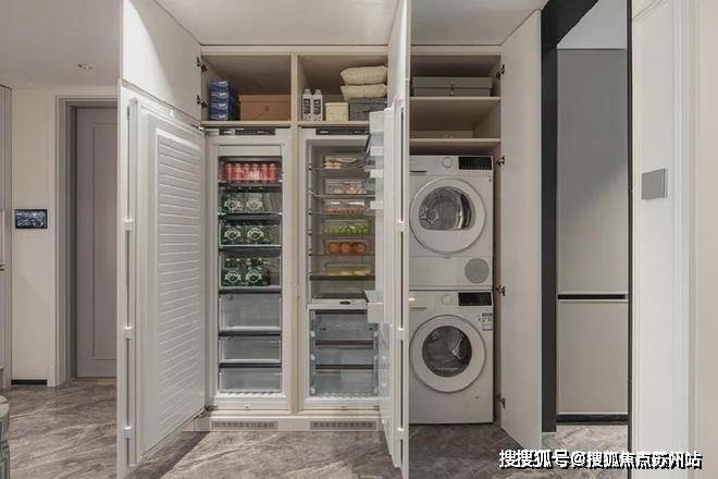 信达信安里预约热线☎:400-8080-420✅✅为了空间更好的布局,冰箱和洗衣机都放置在进门侧边的柜子区域。