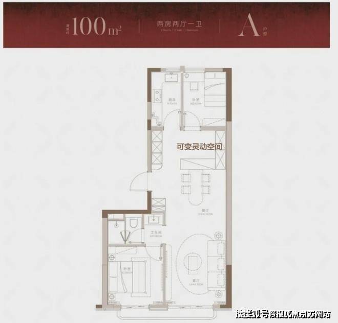 因为100平的2房布局,使得客餐厅一体的布局其实非常开阔,比起100㎡的3房来说,功能缺失一个房间,但现有的实际尺度感要舒适很多。