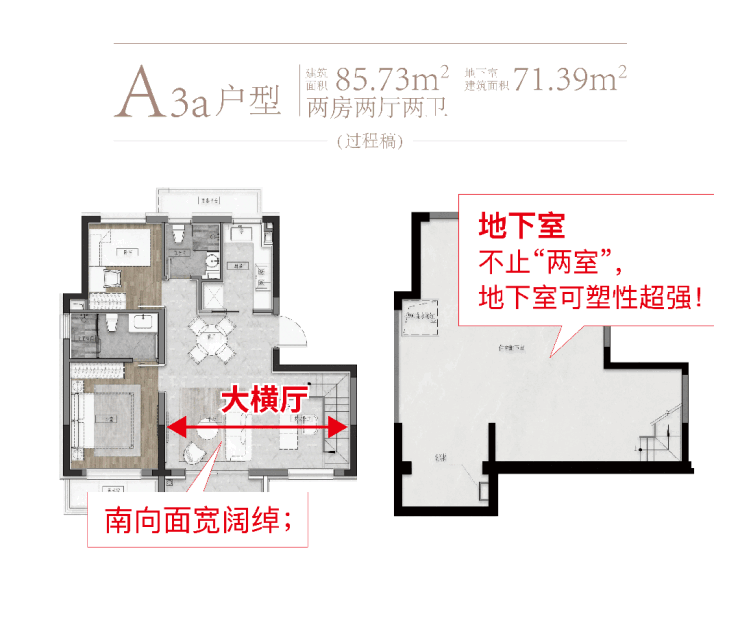 项目底复有多种户型,以地上建面约85.73㎡为例: