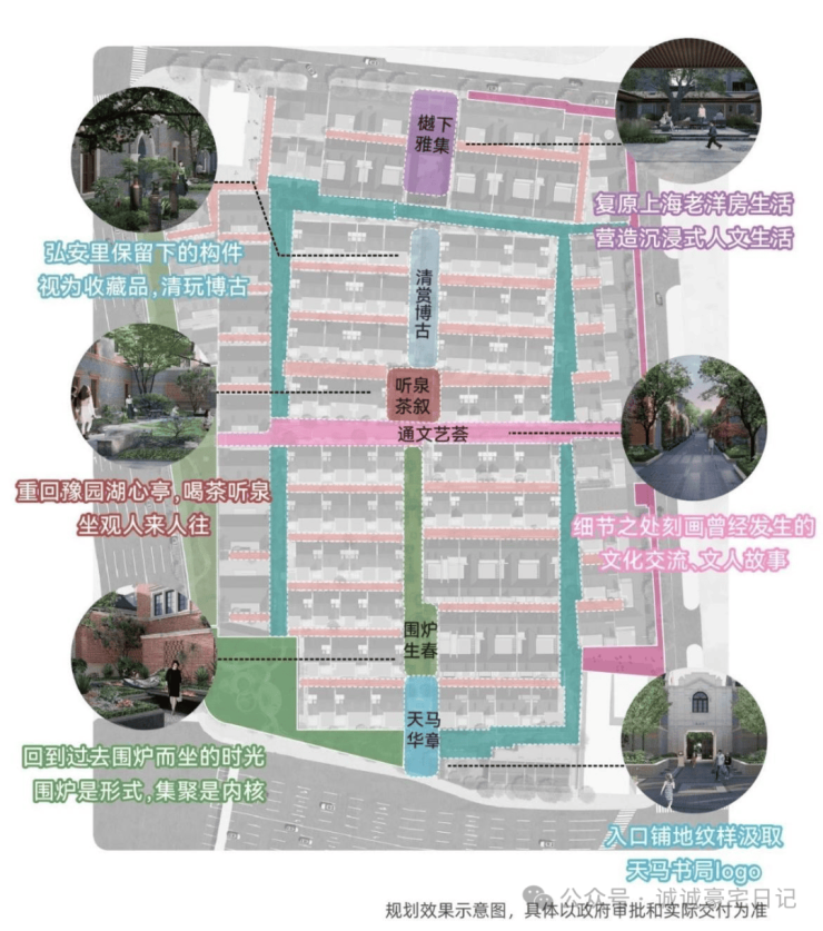 在社区的中轴上,弘安里植入记忆的符号与生活的画面,从入口处「天马华章」迈步前行,「围炉生春」「通文艺荟」「听泉茶叙」「清赏博古」贯穿到此次实景开放的「樾下雅集」,海派生活画卷昨日重现。