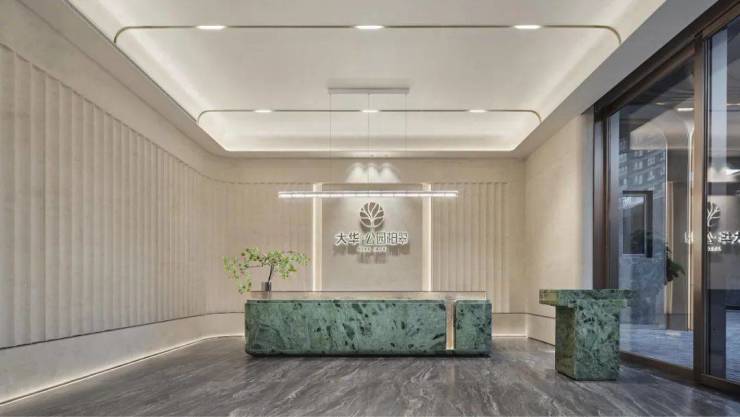 大堂接待台选用产自意大利山脉的宝格绿奢石一体打造而成。