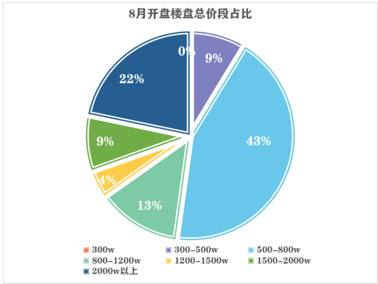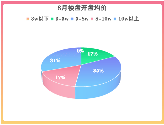 从供应结构来看,8月开盘上市楼盘均价0个为3w以下,4个为3-5w,8个为5-8w,4个为8-10w,7个10w以上。