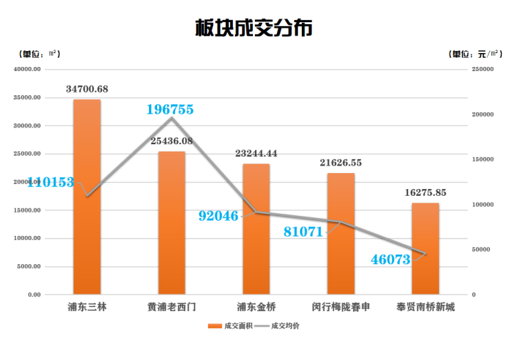成交板块方面, 浦东三林以34700.68㎡的成交面积位居第一。