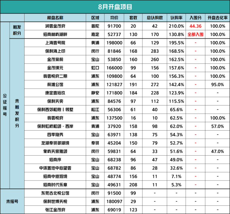 从认购情况来看,8月共计2盘触发积分,最高44.36分,另一盘所有客户均入围,未公布入围分。