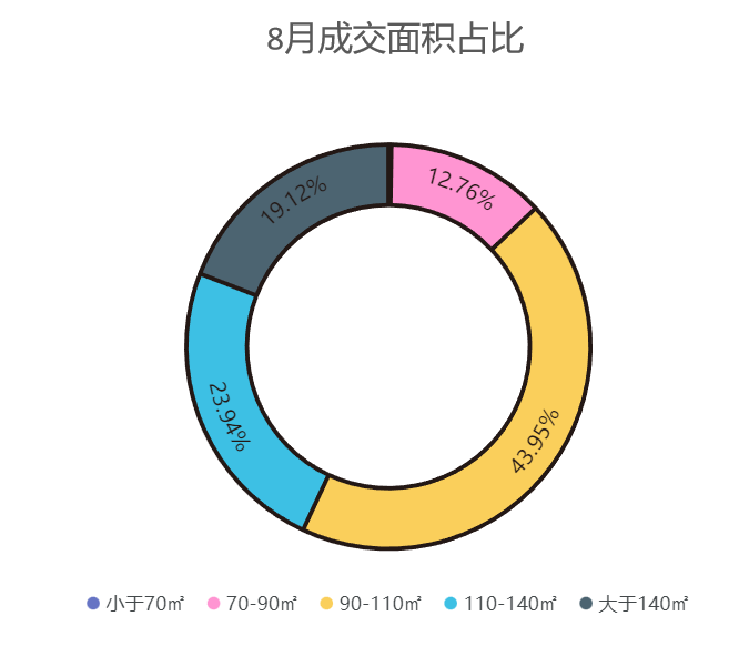成交面积段方面,主力成交面积段为 90-110㎡,成交占比达43.95%。