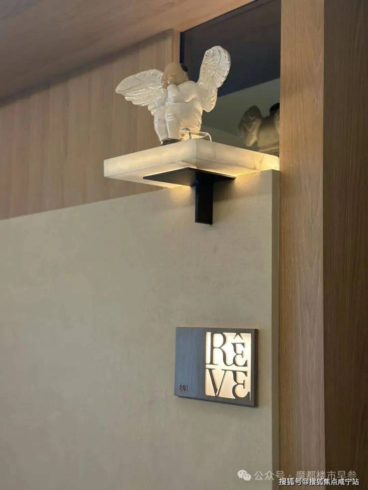 从电梯厅开始,就是酒店式定制化设计,弧形顶设计的电梯厅,门牌上设计了玉石托盘,可以放置家庭独有的摆件,注重仪式感的同时更具高定私享趣味性!