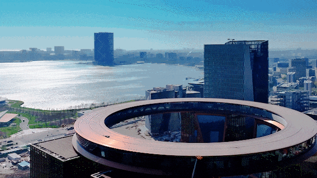 在滴水湖的12点钟方向,一座金色的巨型圆环熠熠生辉,这便是 临港滴水湖金融湾的核心地标——“荣耀之环”。