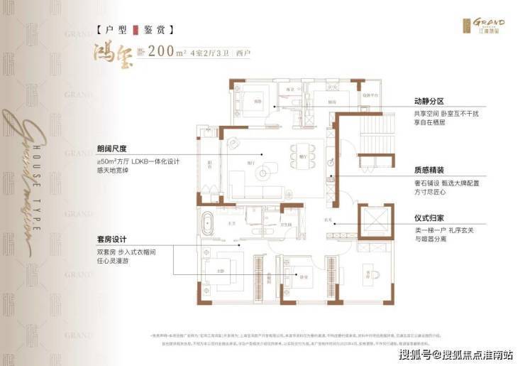 户型设计上,类一梯一户,方厅近50㎡,主卧超级套房。