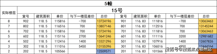 本次首开的5号楼中, 15单元洋房整体均价相对较低,这主要是由于没有高楼层拉升价格。但若对比同楼层单价,洋房119㎡西边套实则是同面积段中单价最高的,洋房中间套价格是最划算的。