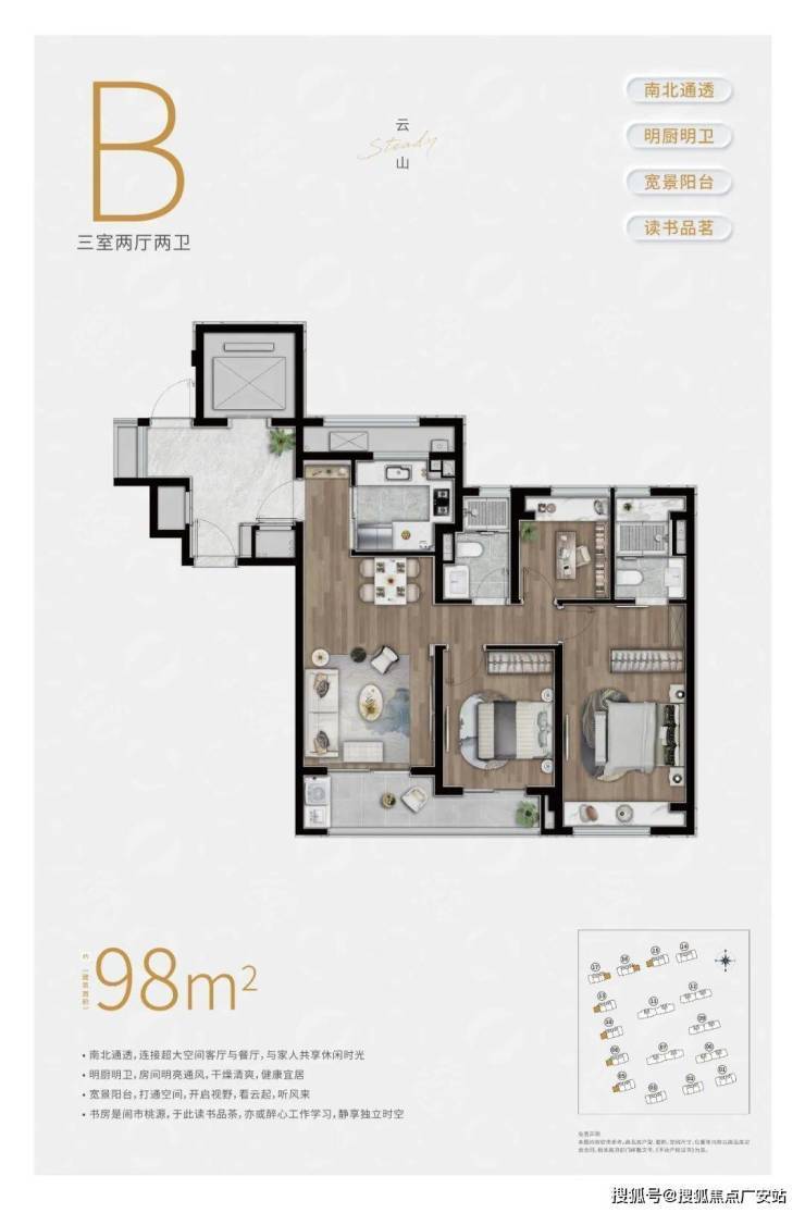 约98㎡3房2卫户型,三开间朝南,并且这贯穿客厅+次卧的超大阳台实在是惹眼,这个南向的视野延展度以及采光度相比同级别的户型来说,要更加出色。