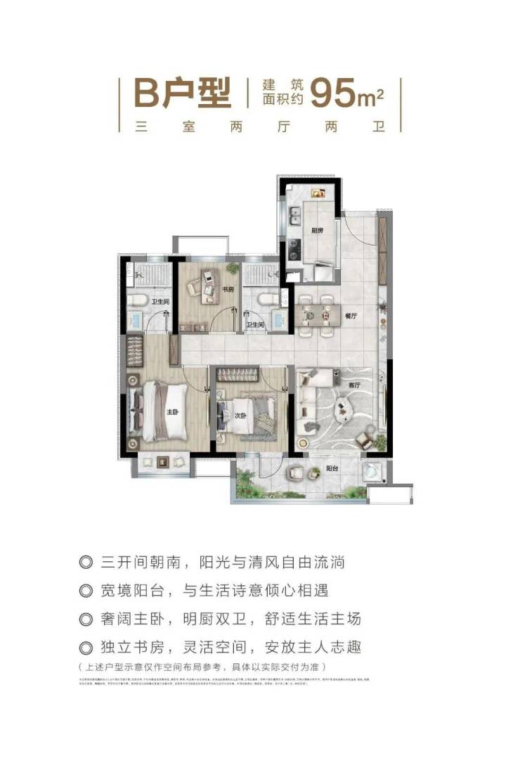 建面约95㎡的3 房2 厅2 卫户型,空间实用性强,能保证业主从二人世界到二 胎家庭的全生命周期需求。餐客厅一体化,还联通了一个近乎双开间的大阳台,主卧也实现了南北通透的设计。