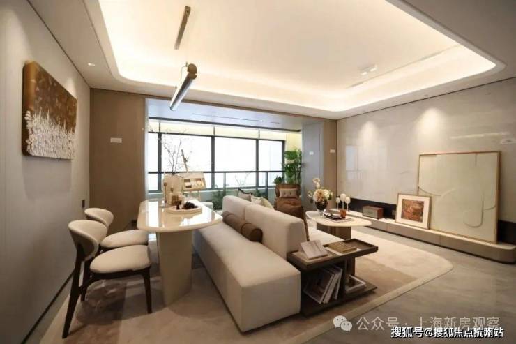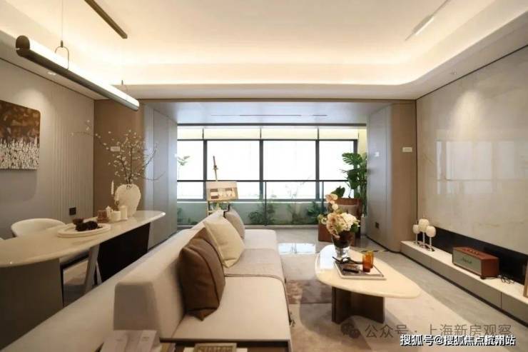 ● 客餐厅:客餐厅地面同样采用了750*1500的大砖,电视背景墙采用浅色大面岩板。顶部采用弧形石膏板吊顶+四边反光灯槽(圆弧角)+吸顶灯+磁吸轨道灯,使客厅空间在视觉上显得更加宽敞。