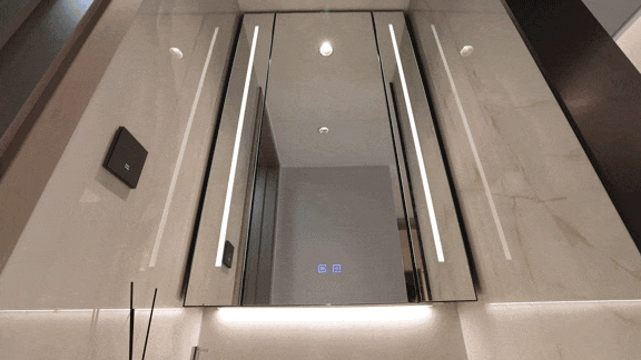 整面墙的镜柜,内部配备了美妆冰箱+门板收纳架+轨道式置物架,储物空间打造的非常充足。