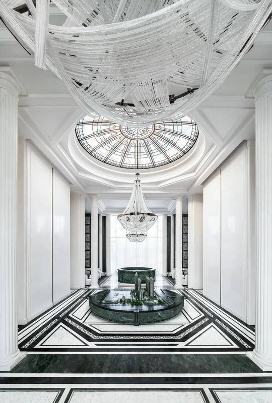 项目以“清和”为文化内核,传承南宋“清和桥”860年历史文脉,将海派文化与现代建筑美学深度融合。归家门庭采用超50米实景设计,结合全域风雨连廊体系,打造无风雨归家动线;门庭外立面以弧形贝金米黄大理石为主调,镶嵌典藏级老虎玉,搭配古铜色艺术灯器,呈现贵雅气质。社区内景观造园独具匠心,引入树龄超60年的紫薇古树,营造“浓荫庇宅”的东方意境;下沉庭院选用土耳其进口老虎玉,由匠人手工打磨60天,还原有温度的休憩空间。