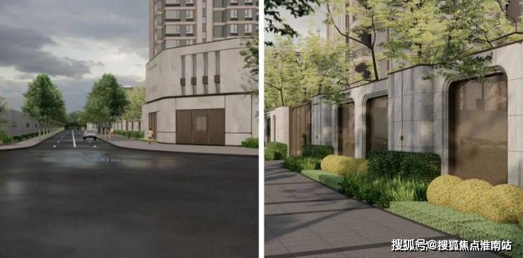 大面的水墨云灰石材贯穿形象大门和单元门头,并搭配精致的金属塔冠设计,以时尚主义营造手法,创造城市的审美张力,贴合现代人的审美需求。