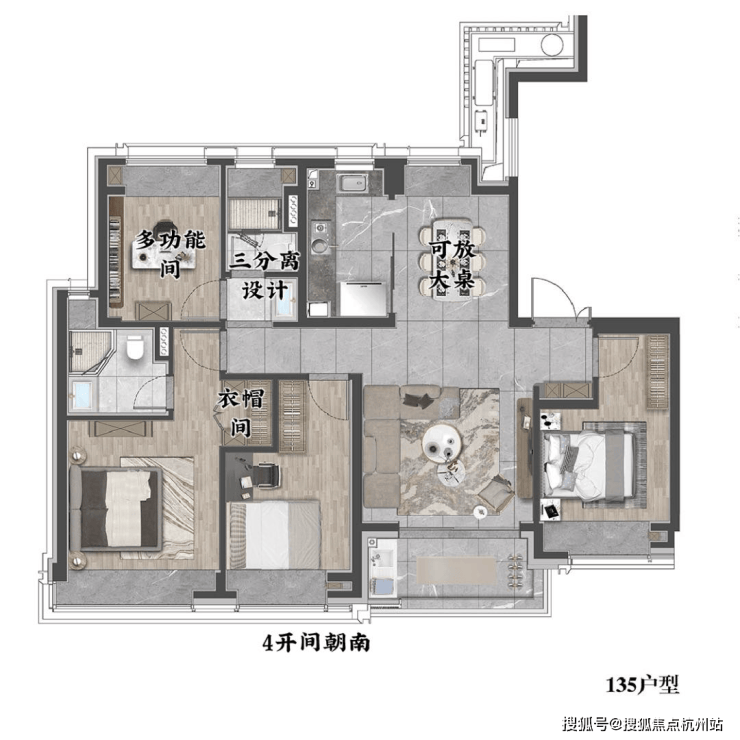 这一户型的功能性就更强了,更能满足多成员家庭的生活场景,南北正向通透的LDKG大厅宽敞明亮,就餐区放得下6人大桌,公卫采用三分离设计,使用功能翻倍,主卧套房打造了衣帽间,仪式感十足;4个房间可以根据业主需求打造多重功能。