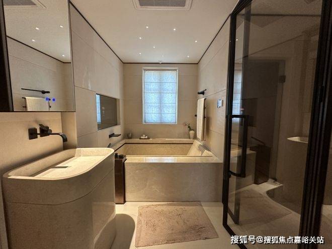 而样板间里这第二个卫浴空间,更接近于享受级。嵌入式浴缸,设计了魔镜系统,可以供业主泡澡时观影娱乐;除此之外,这个卫生间也有独立的淋浴房,并设计有桑拿房。