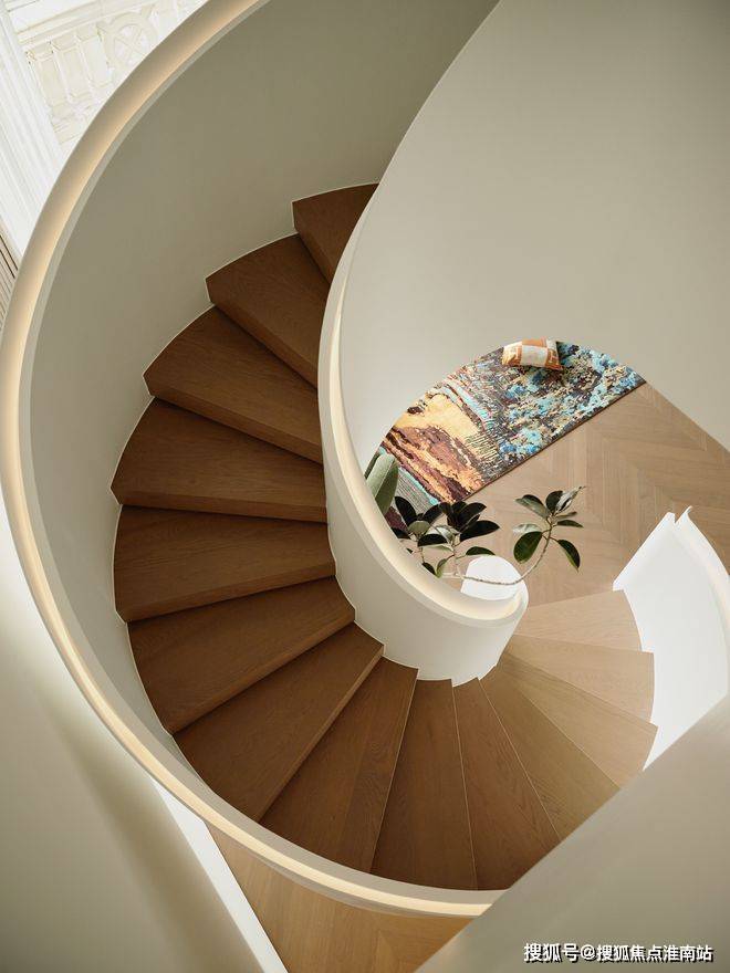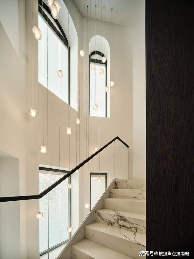 楼梯间水晶灯装置模拟雨滴下坠的瞬间动态,与旋转楼梯的几何韵律共奏空间序曲。