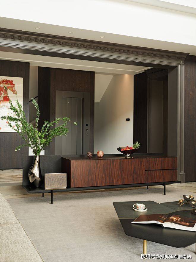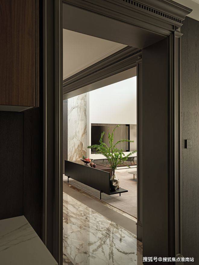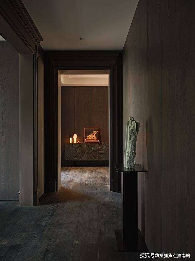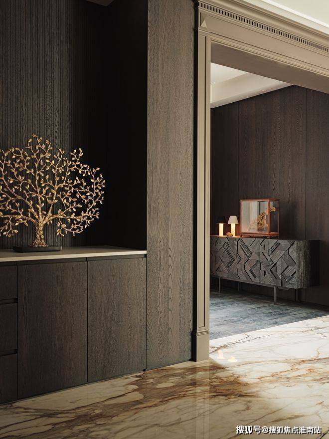 打开这幢别墅的大门,走入的是艺术和情感的殿堂。玄关处吴昊宇艺术作品《新石器》与范思哲的永恒系列地砖共同谱写的时光主题。