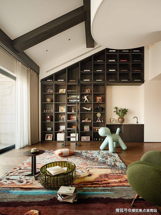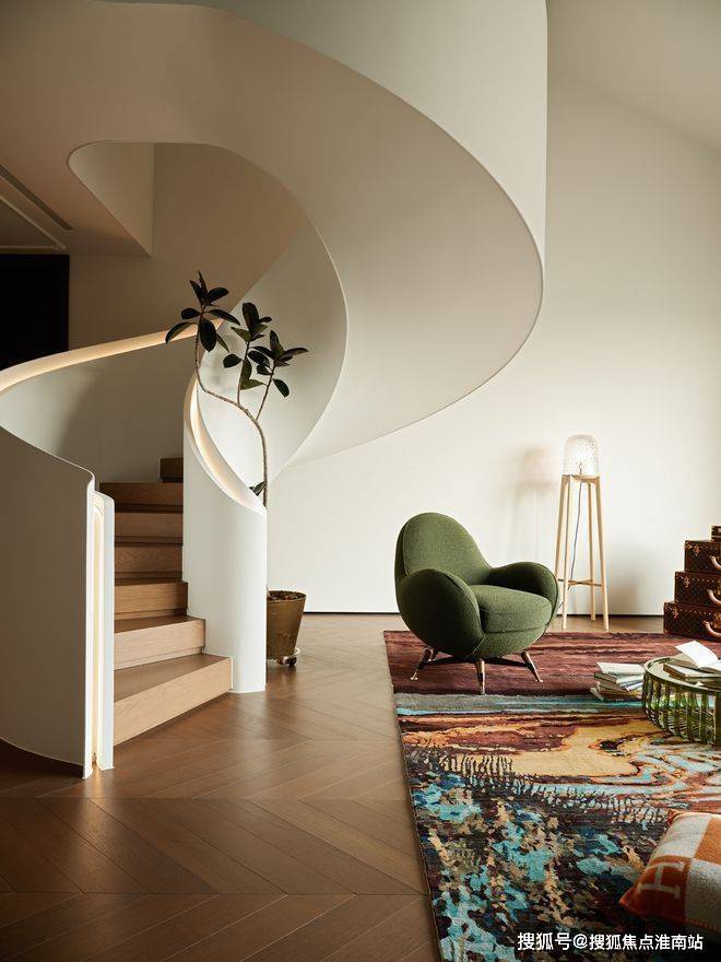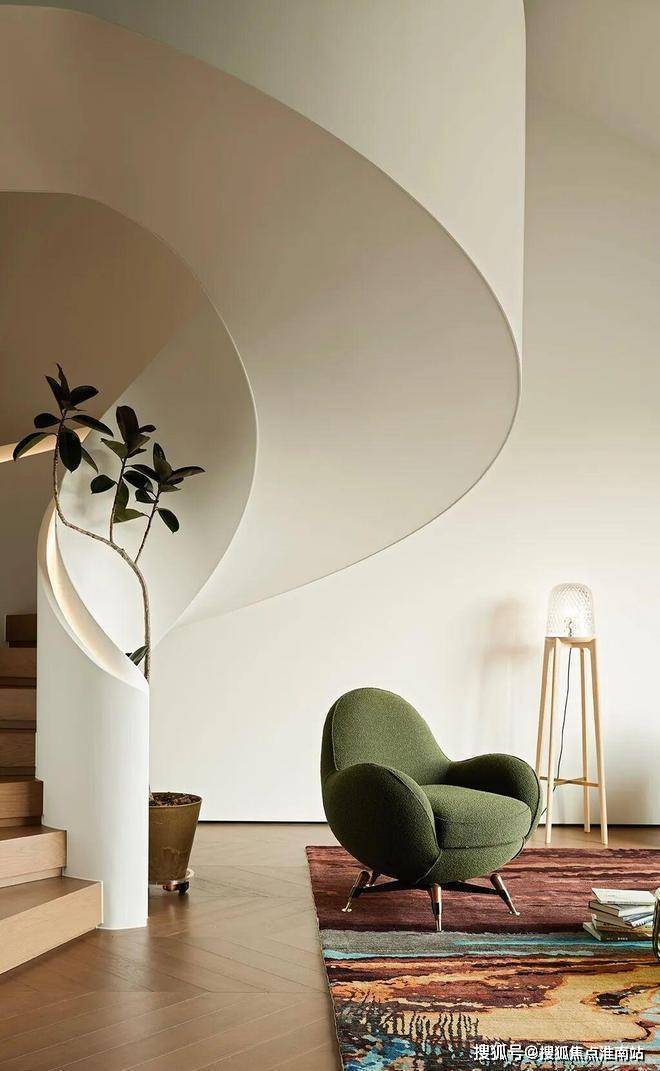 房子内部以“垂直生长”回应家族生命周期。一楼作为家庭社交中枢,6米多高的挑空客厅以卡拉卡塔金大理石纹为幕,石材纹理如水墨恣意流淌,灰色的手工地毯以“时光的褶皱”为精神内核,与Minotti的家具构成刚柔对话。