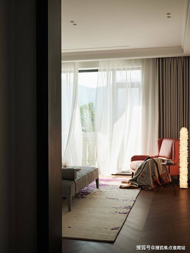 三楼围绕家庭起居厅布置卧室。卧室的地毯是由黄亚兰原创设计的《流动的暮色诗境》,精致的家具与手工羊毛地毯温柔包裹新生家庭的私密时光。