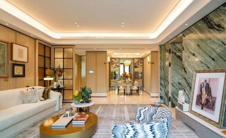 例如入户玄关铺设有“石材皇后”鱼肚印象,这种级别的奢石在很多项目中通常仅作局部镶嵌。