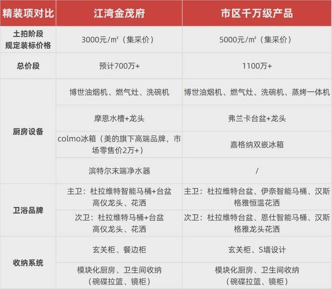 更贴心的是主卫美妆冰箱、“一镜到底”的镜柜、壁龛、厨房的“轻松抽”、餐边柜......收纳力MAX!不多拽文了,直接上对比,江湾金茂府3000元/㎡的装标实在多了