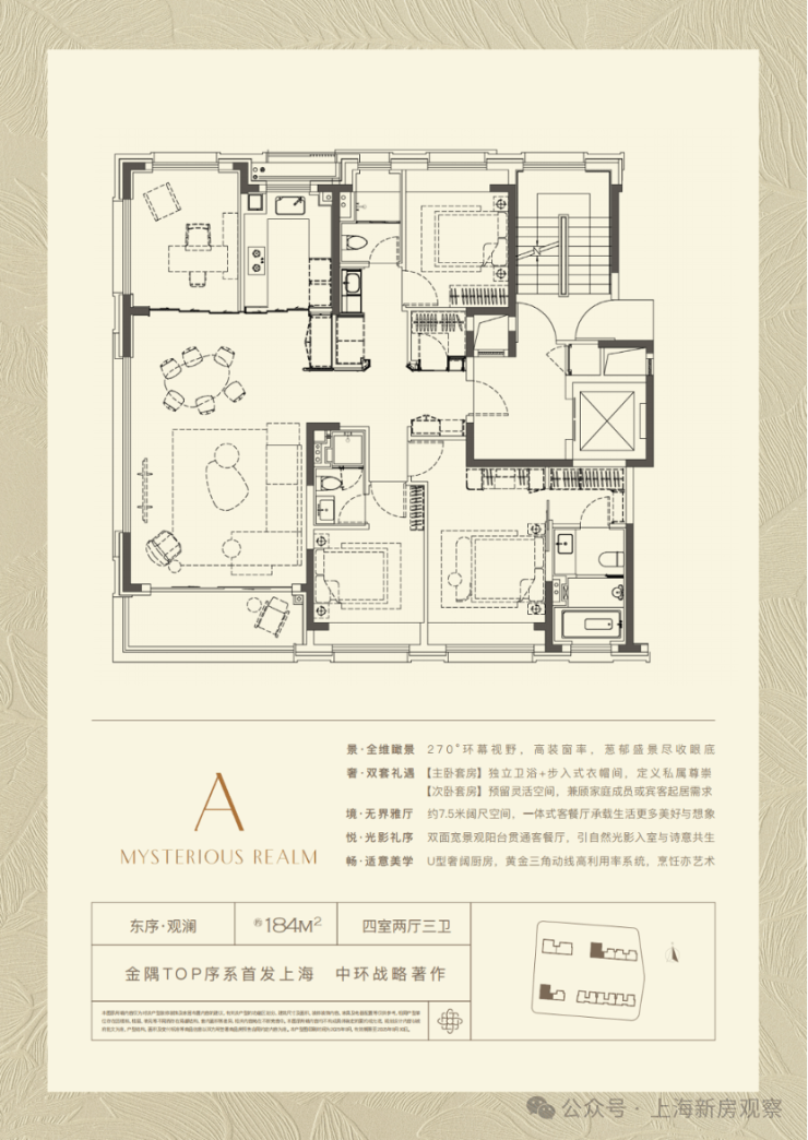 除了A户型,184的B户型则非常符合传统认知:经典的南北向,标准的超大面宽、短进深,克服了市区很多新房由于受地块限制,在设计时总是有一些空间不能尽如人意的弊端,四个空间朝南一定排开,全屋全明设计,没有死角,无论是空间感还是动线都很符合对户型要求较高的买家的需求。