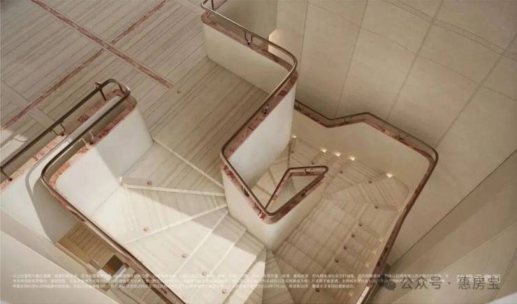 艺术旋转楼梯进入,整块白木纹石材切割+宝格丽粉镶边设计的旋转楼梯,营造社区高雅氛围,步步生花。