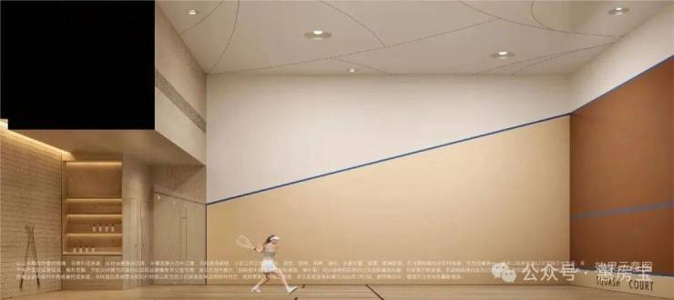 区域首创国标壁球馆、飞瀑园景健身房、嵌入式景观书吧等,整体统一化仿树榴木纹贴面,还原内外统一的高级度假酒店质感。