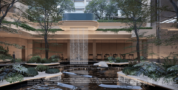 “漂浮的绿洲”,九重层次下沉庭院,区域悬浮泳池+4.3米飞瀑设计,塑造极致度假感受,丰富的视觉奇观。