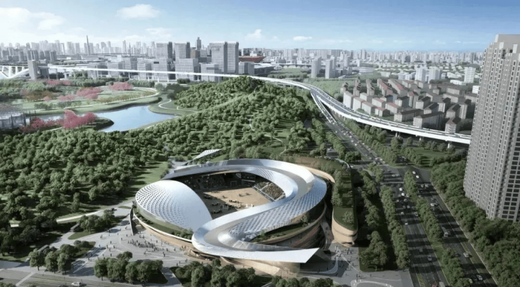 久事国际马术中心是国内首座符合国际顶级马术赛事标准的专业场馆。主体建筑包括竞赛场地、热身场、训练场和马厩等竞赛设施以及5000座的观众看台。山、水、谷的设计理念。目前已完成地上、地下结构、钢结构、升降灯架等重要工序。