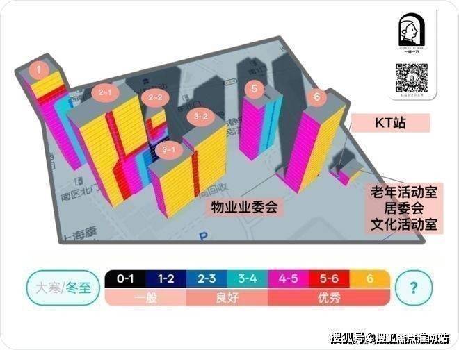 2-1号楼和1号楼相似,中高层无遮挡,低区西侧户型优于东侧。2-2号楼低区遮挡严重,采光一般,但高区采光优秀。