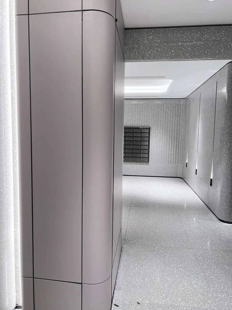 同时,大堂墙面全部采用定制弧面铝板,大理石拼花地面与整体大理石幕墙纵贯天地。